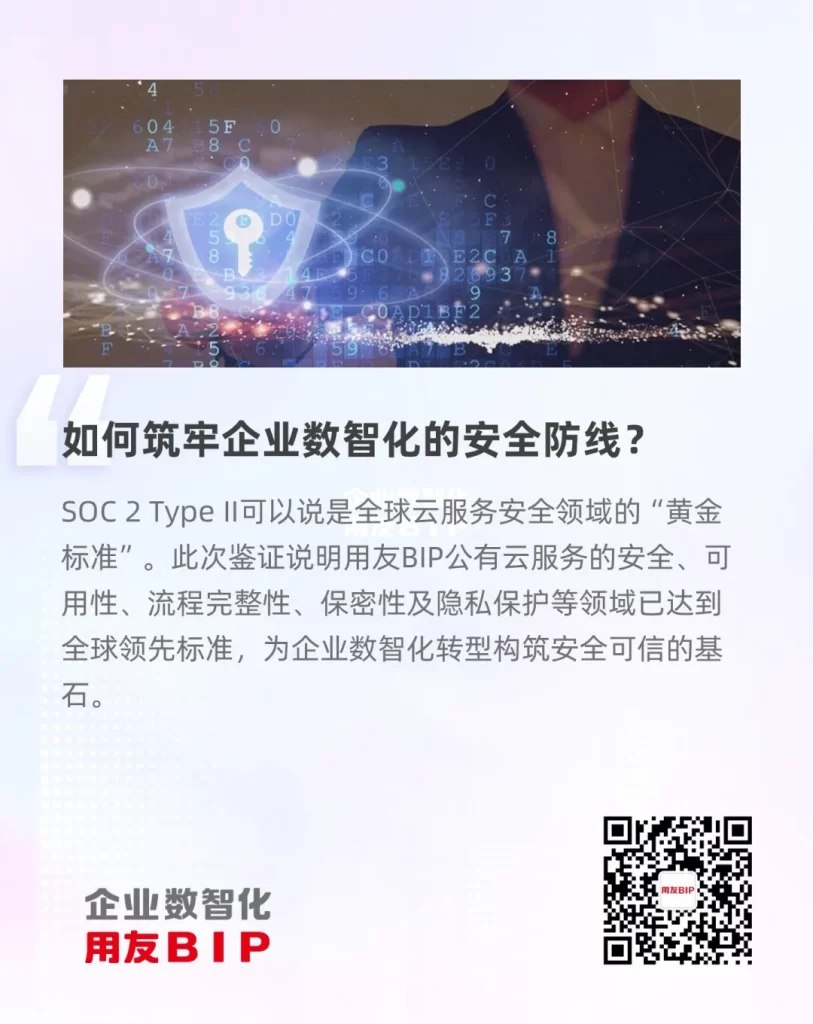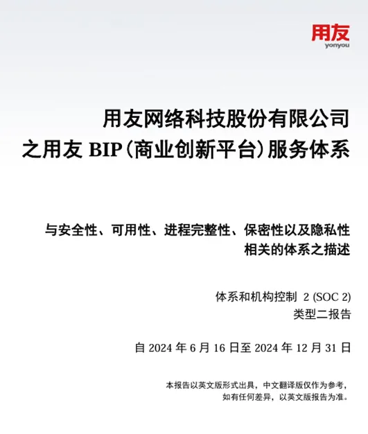 As the global enterprise digital transformation accelerates, cloud business and data security have become core concerns for corporate transformation. Recently, Yonyou BIP’s public cloud services successfully passed the rigorous audit conducted by Ernst & Young Hua Ming LLP, one of the world’s Big Four accounting firms, and officially obtained the SOC 2 Type II attestation report. This internationally recognized certification signifies that Yonyou BIP has achieved global leading standards in public cloud service security, availability, process integrity, confidentiality, and privacy protection, providing a secure and reliable foundation for enterprises undergoing digital transformation.